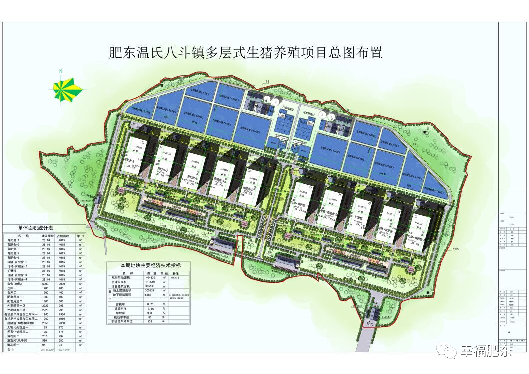 肥东温氏楼层养猪项目一期项目选址位于八斗镇盛岗村,规划占地面积约608亩,主要为猪场建设和设备选购安装以及场区内道路、绿化、消防、水、电设施等建设,计划投资6.5亿元,总建筑面积291000平方米,年出栏肉猪40万头以上;二期项目新增年出栏肉猪15万头以上。