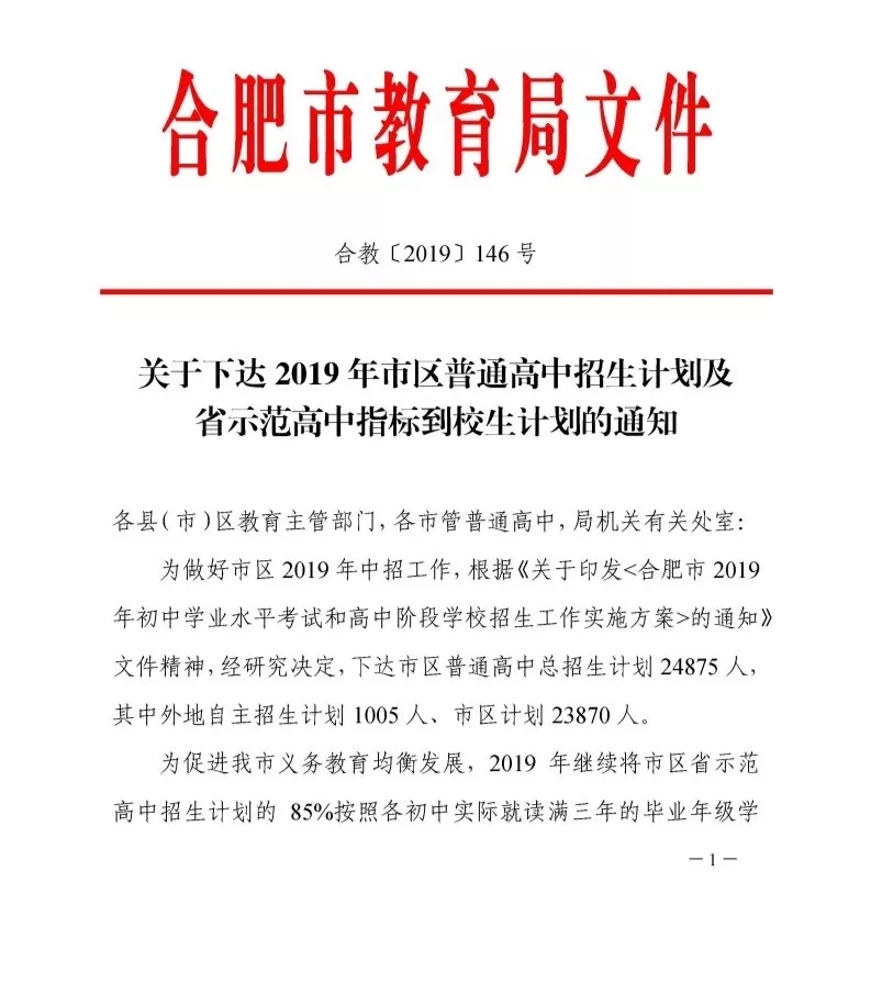 2019年合肥市区高中招生计划公布 详细指标名额来了