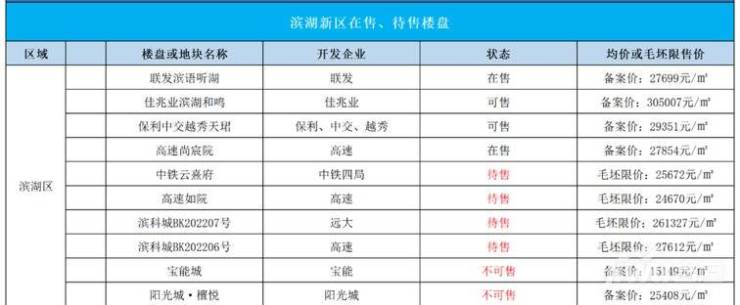 滨湖目前在售楼盘共5座,待售楼盘有4座,分别是:高速尚宸院、阳光城檀悦、 联发滨语听湖、佳兆业滨湖和鸣 、文一塘溪津门;高速尚如院(待售)、远大璟庭里(待售)、中铁璟和院(待售)、高速尚阖院(待售)。