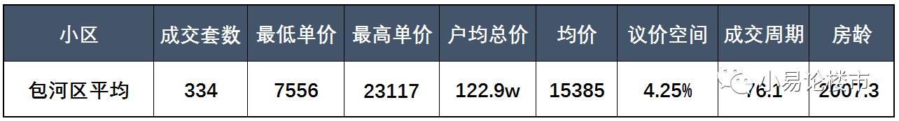 包河区链家2017年前三季度共成交334套二手房,成交均价在15385元/平米,户均总价122.9w,平均议价空间为4.25%,成交周期为76.1天,平均房龄为2007.3年。