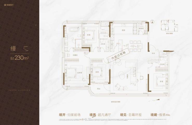 最大户型为230m²,为四室两厅三卫的布局。厨房采用中西厨设置,功能性更强,使用更加便利,操作面更宽敞。此外,还配备了家政间,提供更多的储物空间,足以容纳更多的生活物品。这样的设计可以满足购房者对于生活品质和舒适度的需求,让他们在家中享受更加便利和舒适的生活。