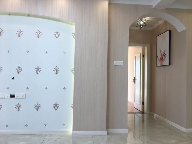电视墙没有做什么特别的造型,只是在中间做了拱形门的设计,中间部分是贴的壁纸。