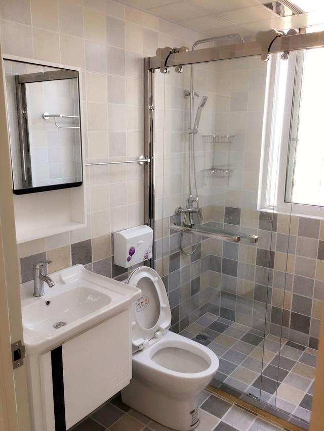 卫生间整体上很清新,墙砖选的很棒,专门装了淋浴房隔出洗澡间,这样就不担心水溅的到处都是啦。