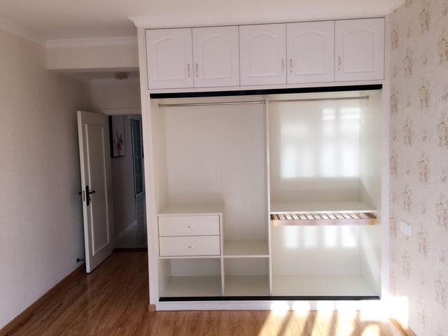 这间是主卧,只有背景墙那边贴了墙纸,卧室都是铺的木地板,没有做吊顶只是走了一圈石膏线,衣柜的门还没装上去。