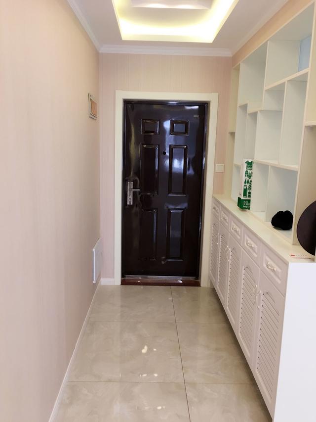 这是进门的地方,进深比较长,所以一边做了整面墙的柜子,下方是储物柜可以放鞋子,上方是置物架。