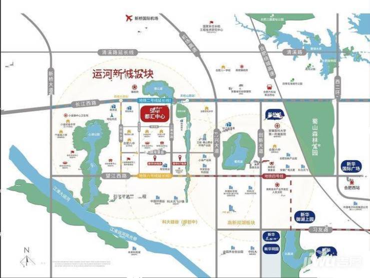 生活配套方面,新华都汇中心除了有自建的商业,还有规划的多所学校,例如合肥八中,五十中,安居苑等优质教育资源,项目附近还有规划建设的心湖公园、德公湖,自然资源丰富。