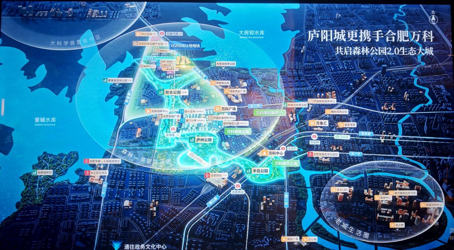 双湖环绕(董铺湖、大房郢水库)+ 五园围合(董铺国家湿地公园、双水公园、庐州公园等)。