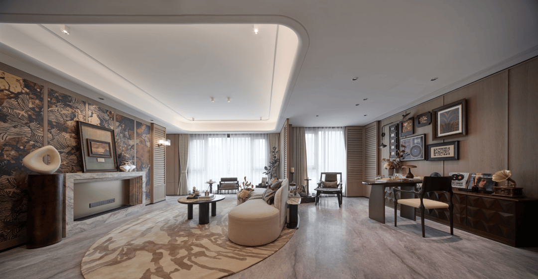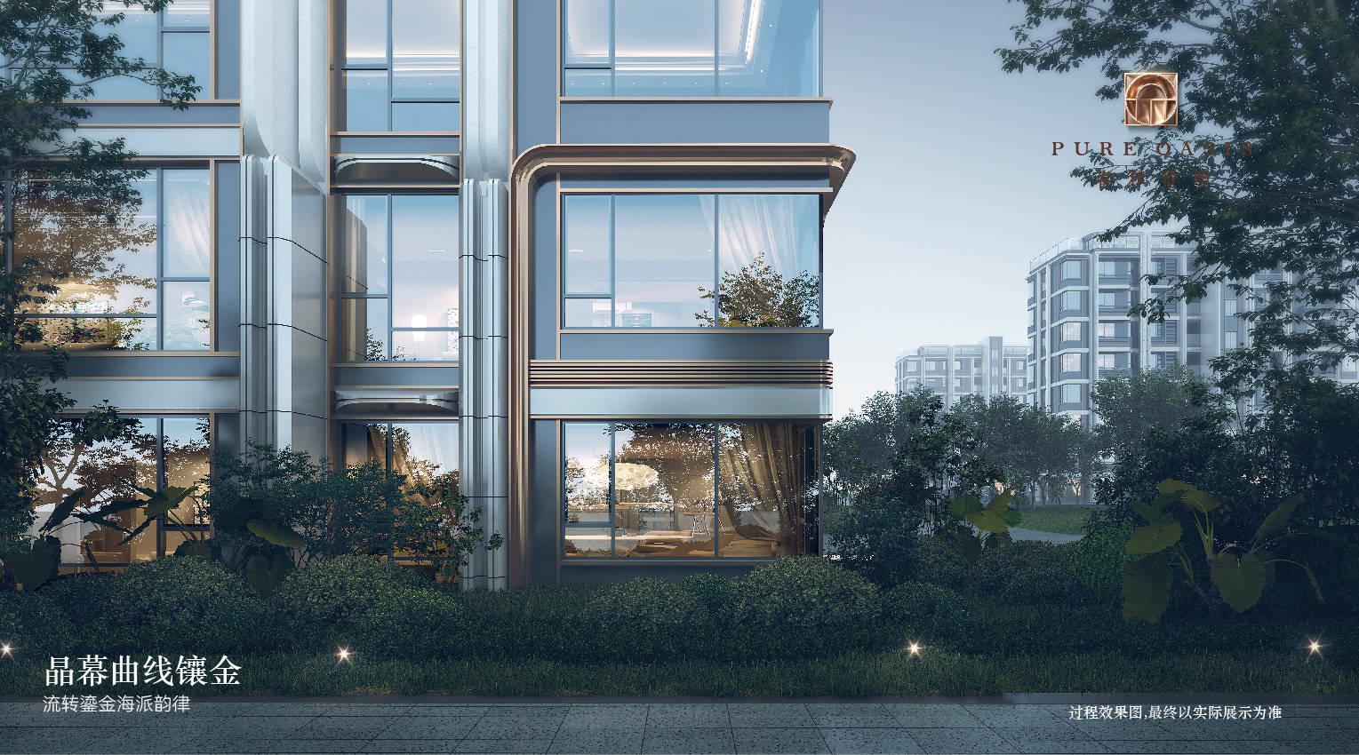 9米高海派门庭,融合Art Deco风格,外立面采用玻璃幕墙+铝板。