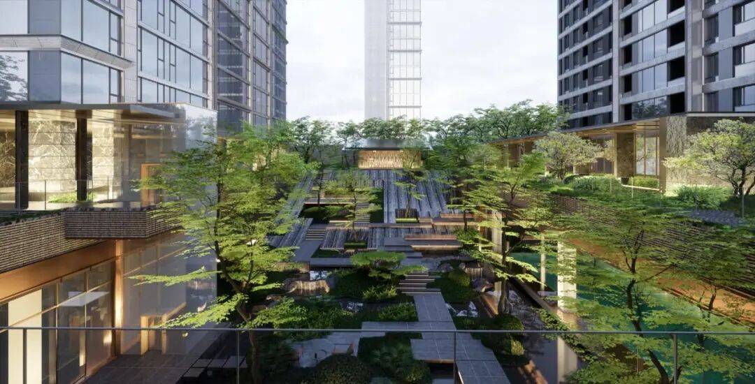 低密社区:绿化率40%,规划“两轴八景”园林布局,融合现代几何艺术与传统中式美学。