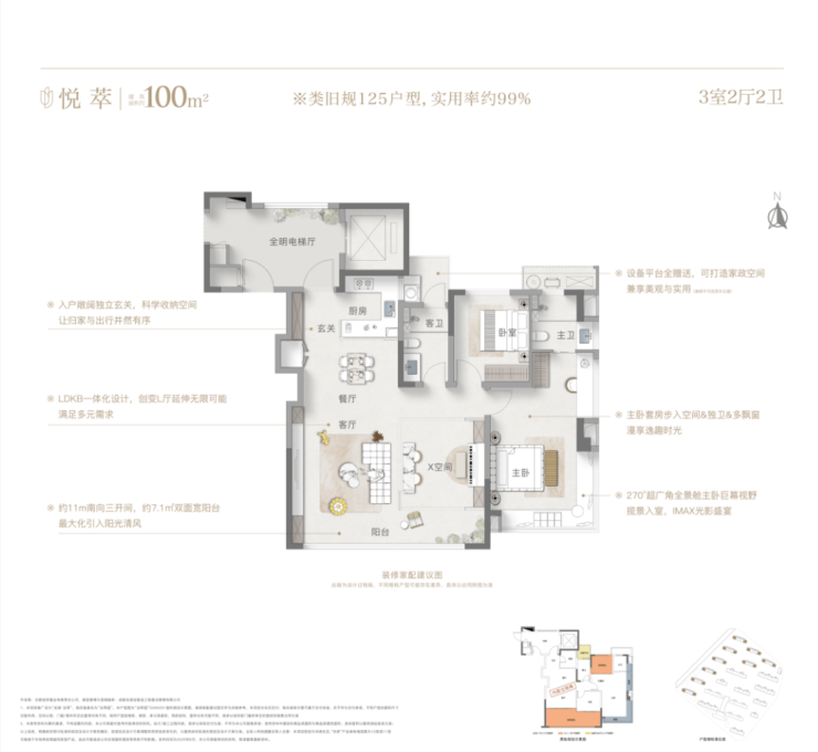 建筑面积约 125 平方米的三室两厅两卫户型,专为改善型家庭打造,居住舒适度与品质感兼具。户型采用经典三开间朝南设计,采光面宽达 11.5 米,南北通透,通风效果极佳。客厅面宽 4.5 米,与南向宽景阳台相连,阳台面宽 4.5 米、进深 2.0 米,视野开阔,可作为休闲观景台、绿植区或亲子活动区,提升生活质感。主卧套房设计,配备独立卫生间、衣帽间与全景飘窗,面宽 3.9 米,空间阔绰,私密性强;南向次卧面宽 3.4 米,可作为儿童房或长辈房,采光充足,居住舒适;北侧次卧面宽 3.2 米,可改造成书房、茶室或客房,满足品质生活需求。厨房 U 型布局,操作动线合理,与餐厅相邻,用餐方便;公共卫生间干湿分离,位于两个次卧之间,使用便捷。该户型精工细节满满,如主卧全景飘窗采用 low-E 玻璃,隔音隔热;卫生间配备防雾镜、防滑地砖;厨房配备品牌五金件,耐用易清洁,空间布局合理,功能齐全,适合追求品质生活的三口之家、四口之家。