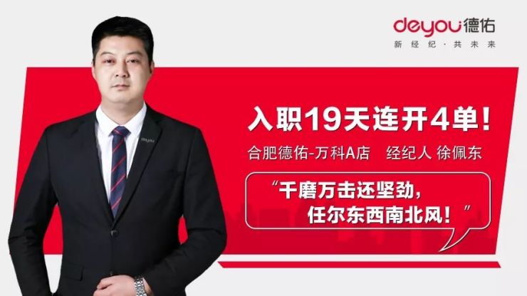 2019年3月6日,徐佩东入职合肥德佑万科A店;3月19日,入职13天成功签约排名前列单--合肥院子,3月24日,入职18天,连开两单--国贸天成,3月25日,入职19天,成功签约第四单--新城悦隽九里。谈及签约感受,徐佩东说道:“千磨万击还坚劲,任尔东西南北风!”