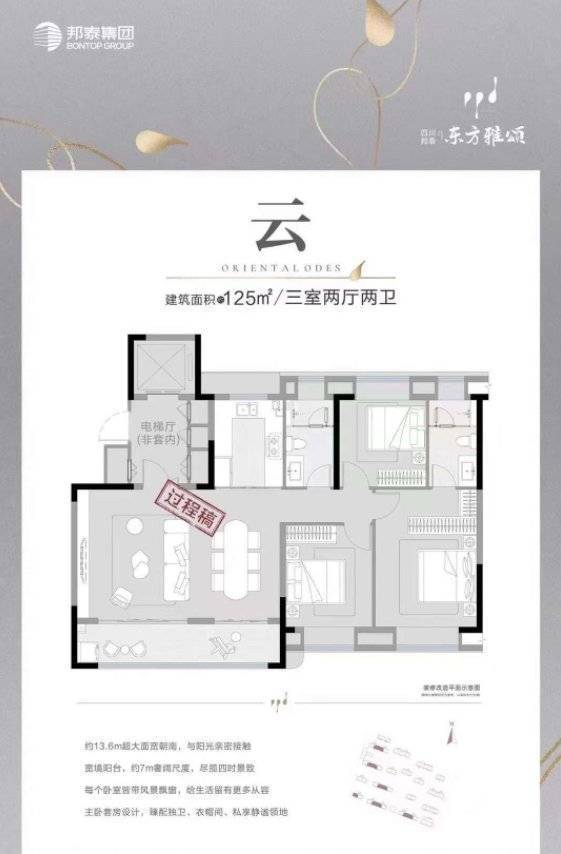 四川邦泰东方雅颂规划拟建16栋住宅,其中12-17F的小高层共7栋,低密度多层9-10F共9栋,为满分作品,容积率1.8,绿化率43%,户型面积125-143㎡,楼盘建筑标准高,精装修交付,无论用材用料,还是装修空间设计,细节处处追求品质。