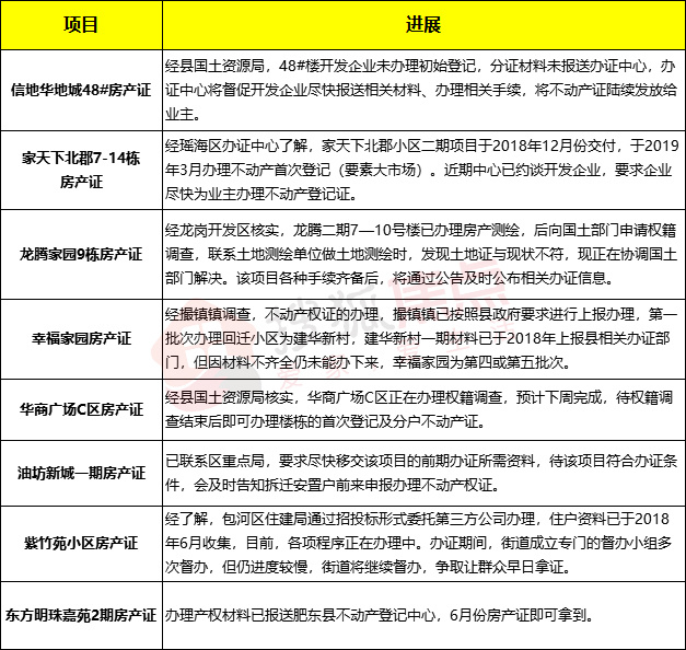 回答:经龙岗开发区核实,龙腾二期7—10号楼已办理房产测绘,后向国土部门申请权籍调查,联系土地测绘单位做土地测绘时,发现土地证与现状不符,现正在协调国土部门解决。该项目各种手续齐备后,将通过公告及时公布相关办证信息。