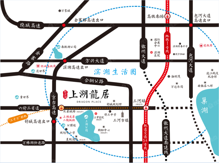 徽州大道南延线、京台高速、合铜公路、环巢湖大道、合安高铁以及规划中的S4号轻轨及舒城“三千万”轻轨构成立体交通,完全可以畅达全城。