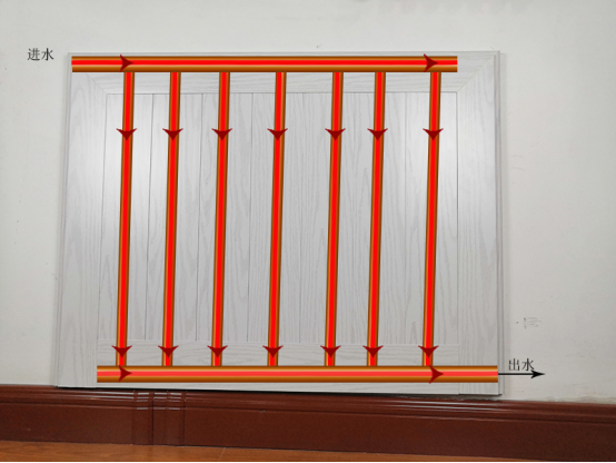 和传统暖气片一样也是水暖,供暖时,热水通过系统管道输送到主管内,然后分流到每片散热片支管,向下流动,汇集到下面的主管内,再流出墙暖到系统回水管,从而周而复始,热水通过墙暖内部流动时,热量通过水道壁传递给翅片,再传递到前面板,然后以热辐射的方式向室内进行散发,从而加热室内空间。
