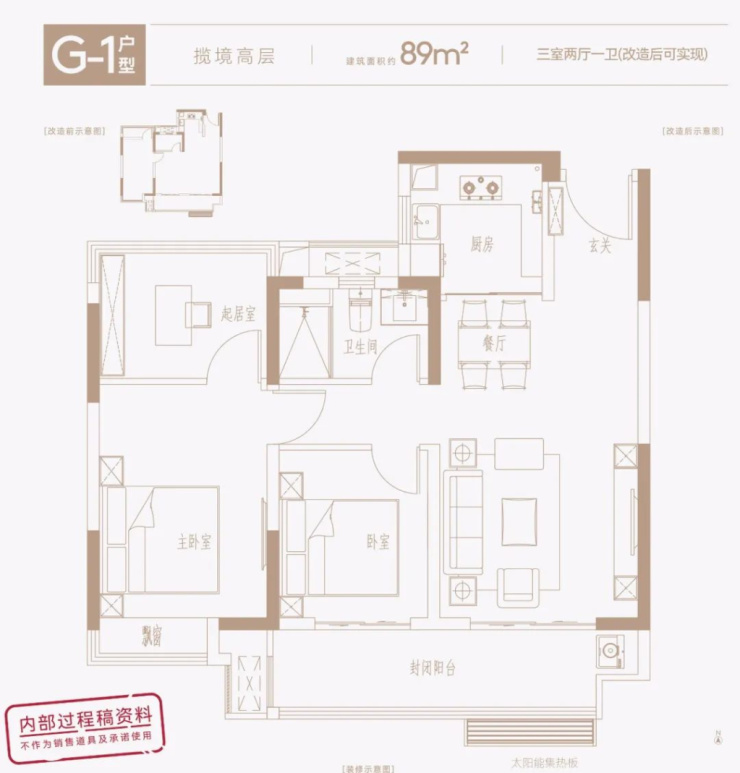 户型方面,建面约89㎡的高层户型:南北通透,三开间朝南,整体布局端正。餐客厅一体,采用双阳台和开放式设计;卫生间干湿分离,且客卧拥有大面积自然采光。