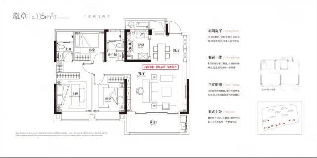 主卧采用套房设计,配备独立卫生间与步入式衣帽间,独立卫生间做到干湿分离,空间宽敞,使用方便;步入式衣帽间收纳空间充足,可分类存放衣物、鞋帽、箱包等物品,满足改善型家庭的收纳需求。南向次卧带有观景飘窗,可作为儿童房,紧邻主卧,方便家长照顾孩子;北向次卧可作为长辈房或书房,空间宽敞,居住舒适。厨房采用 L 型布局,操作空间充足,与餐厅相邻,动线合理;厨房配备整体橱柜与品牌厨房电器,同时预留小家电位置,方便使用。公共卫生间位于两个次卧之间,干湿分离,使用方便,避免家庭成员之间的使用冲突。该户型空间宽敞、功能完善,同时靠近商业配套,能够满足改善型消费家庭的居住与生活需求。