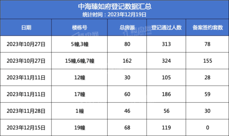 2023年10月27日,项目首开推出5幢、3幢、15幢、6幢、7幢,共242套房源,截止至12月19日备案签约达233套,去化率96.28%。
