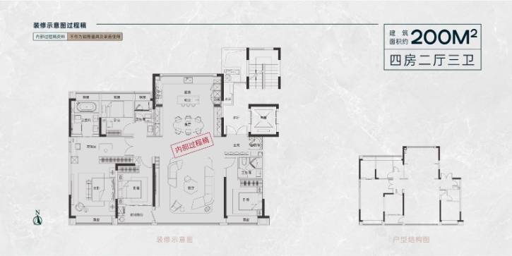 200㎡的户型则增加了更多的储物空间和操作台面,考虑到了居住者的实际需求。该户型设计有四间卧室和一个独立的书房或休闲区,主卧更为豪华,同时还留有空间可用作储物间或衣帽间,满足了家庭存储和生活的需求。