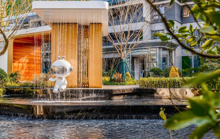 水流应势跌落,水珠喷涌而出,恍如再现白居易笔下的“大珠小珠落玉盘”。两侧则被浓密绿化包裹,时令花朵点缀其间,潺溪引蝶空间愈加立体。