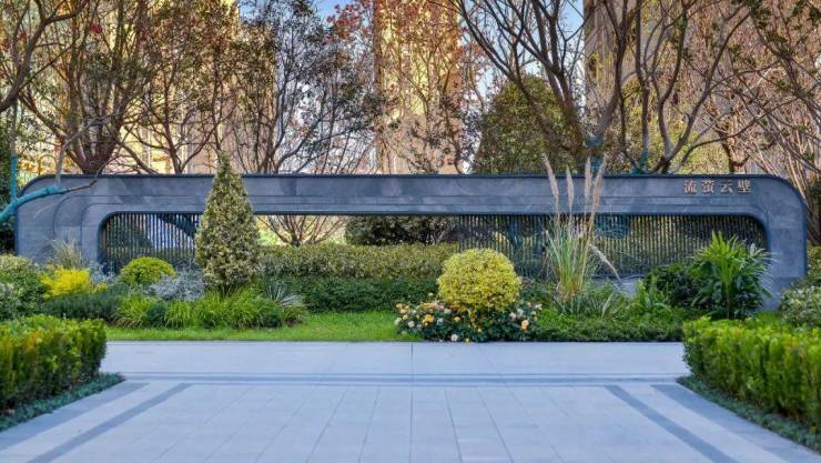 礼序夹道的尽头是“流萤云壁”的影壁墙。作为礼序夹道的终点,同样也是小区园林景观的入口,这里花红草绿,五彩缤纷,自成一景,美不胜收!