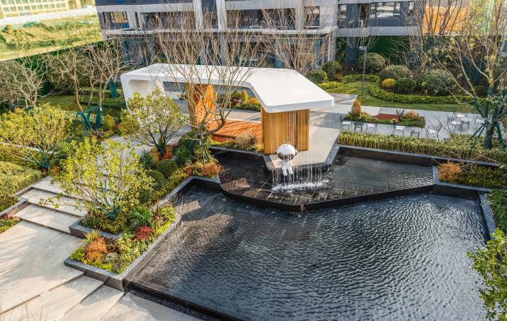 两米高叠瀑首先映入眼帘,三层镜面水景层层叠叠,错落有致。