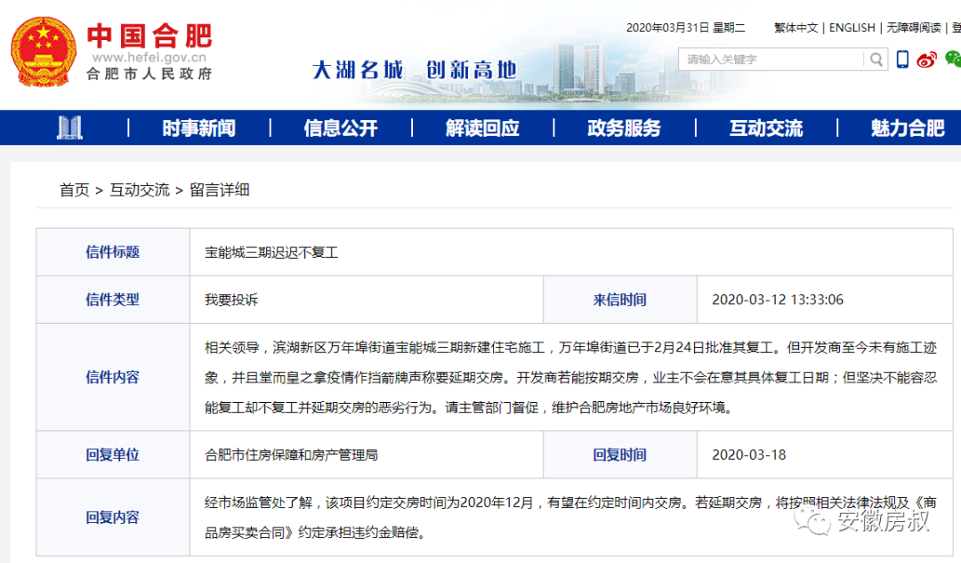 投诉内容:滨湖新区万年埠街道宝能城三期新建住宅施工,万年埠街道已于2月24日批准其复工。但开发商至今未有施工迹象,并且堂而皇之拿疫情作挡箭牌声称要延期交房。开发商若能按期交房,业主不会在意其具体复工日期;但坚决不能容忍能复工却不复工并延期交房的恶劣行为。请主管部门督促,维护合肥房地产市场良好环境。