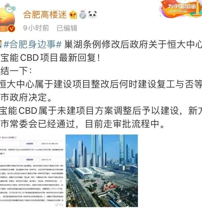 不过,就在前几天,微博博主合肥高楼迷爆料,表示官方消息透露,合肥宝能城超高层有了新进展!