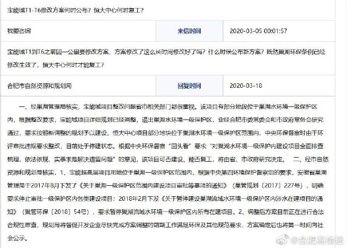 二、经市自然资源和规划局核实,1、宝能超高层项目用地位于巢湖以及保护区内,根据中央第四环境保护督察组的要求,安徽省巢湖管理局于2017年8月下发了《关于巢湖一级保护区范围内建设项目审批等事项的通知》(巢管规划[2017]227号)明确要求停止审批以及保护区内各类建设项目;2、调整后方案目前正在进行合法合规性审查,规划局将督促开发企业尽快完成方案调整的前期工作满足环保和其他规范要求,方案确定后也将排名前列时间向社会公示。