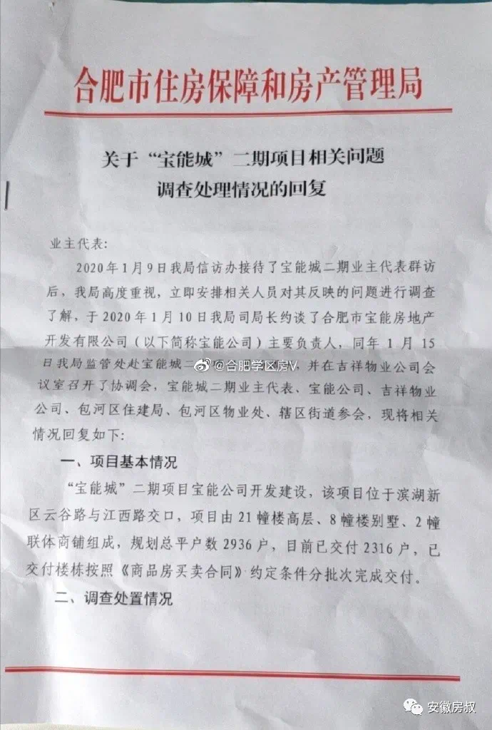 3月26日,合肥市住房保障和房产管理局,发布了《关于“宝能城”二期项目相关问题调查处理情况的回复》。