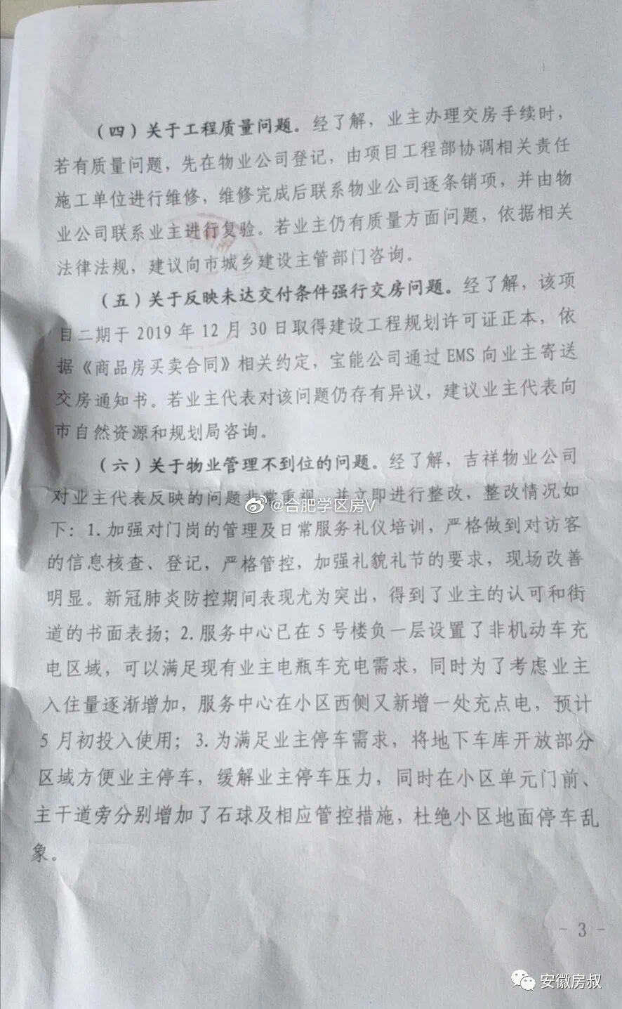 业主代表,2020年1月9日我局信访办接待了宝能城二期业主群访后,我局高度重视,立即安排相关人员对其反映问题进行调查了解,于2020年1月10日我局司局长约谈了合肥市房地产开发有限公司(以下简称宝能公司)主要负责人,同年1月15日我局监管处赴宝能城二期项目调研,并在吉祥物业公司会议室召开了协调会,宝能城二期业主代表、宝能公司、吉祥物业公司、包河住建局、包河物业处、辖区街道参会。