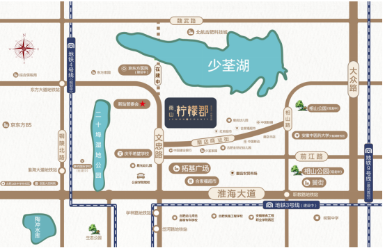 【南山·柠檬郡】立于少荃湖南,新站管委会对面,自然环境优越,更坐享内外兼修的完备配套。磨店老街、拓基广场、黉街等繁华近享,168中学、庆平希望学校、磨店幼儿园等人文环伺,京东方医院、安医大四附院新区等健康护航,在建地铁3、4号线幸福提速……将一席少荃湖南的都荟湖居大境,在这里丰盛启幕!