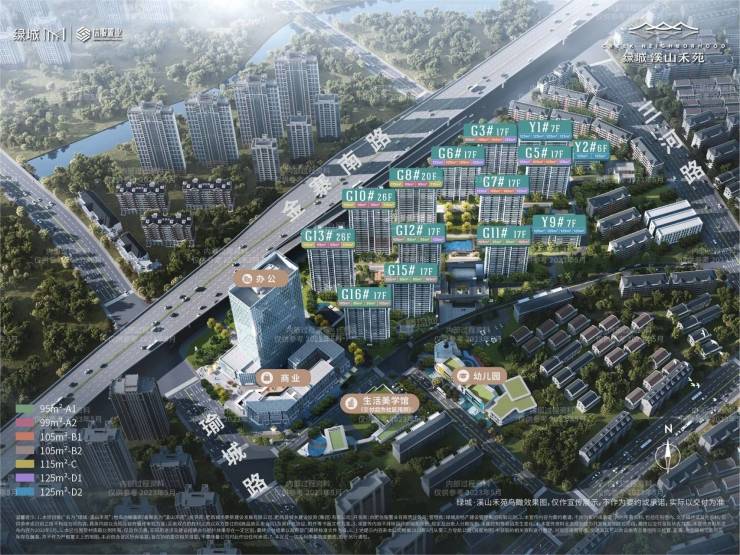 绿城溪山禾苑容积率仅有1.8,采用了绿城一贯的中轴对称的设计,规划14栋住宅,其中仅有3栋高层,其他均为小高层和洋房产品,另外还有配套商业和一栋写字楼,以及代建的幼儿园,户型面积段95-125㎡。