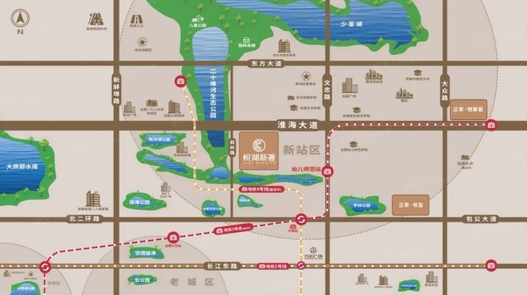 悦湖新著项目位于新站高新区淮海大道以南、前岭路以东,正好处于少荃湖板块和职教城板块的交汇处。称得上是新站区的中心地段了,也同时有着少荃湖的湖景资源和职教城板块的教育资源,总体来说优势是非常明显的。