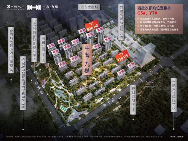 中海九樾于8月21日新推建面约120㎡毛坯小高层G3#,建面约128㎡精装洋房Y7#,视野优质,采光好。该项目位于滨湖金融中心板块,是近年来政府打造的重点区域。目前中海九樾在售面积为高层120㎡三房,洋房128㎡四房,140㎡-165㎡四房。最后一栋少有毛坯小高层,低密精装洋房火热销售中,有意者可电话咨询售楼处