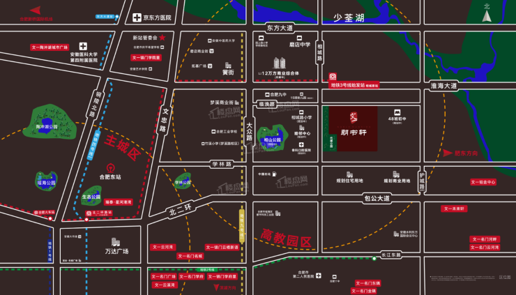 文一朗书轩项目是文一地产深耕安徽布局新站的第四子,位于相城路与临涣路交口东南角,直线距地铁3号线“相城路站”仅约300m,周边拥有约百亩生态公园、省重点高中合肥九中(新校区),此外还有安徽医科大学第四附属医院、京东方医院(安徽第一家数字化全科医院)云集,生活配套比较齐全。