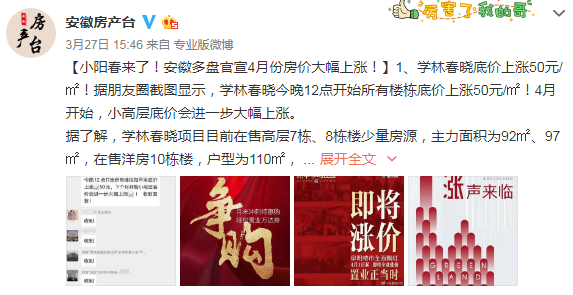 近日,据微博爆料,安徽多盘官宣4月份房价大幅上涨!至少有14个楼盘,纷纷发布涨价海报,近日起执行!