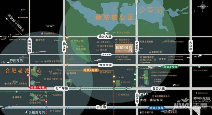 国贸璟原项目地处新站区少荃湖板块,具体位于文忠路与龙子湖路交叉口,位置上紧邻主干道文忠路快速路,距离地铁三号线、四号线也比较近,项目周边还有少荃湖湿地公园,京东方医院、百大商业广场、黌街、磨店老街,以及竹溪小学等,生活配套完善,满足日常基本所需,项目附近还有多个住宅小区,人居氛围相对比较浓厚,环境还是比较宜居的。