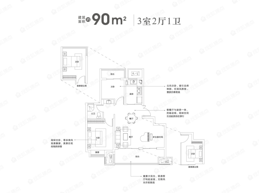 文一朗书轩90㎡3室2厅1卫户型图