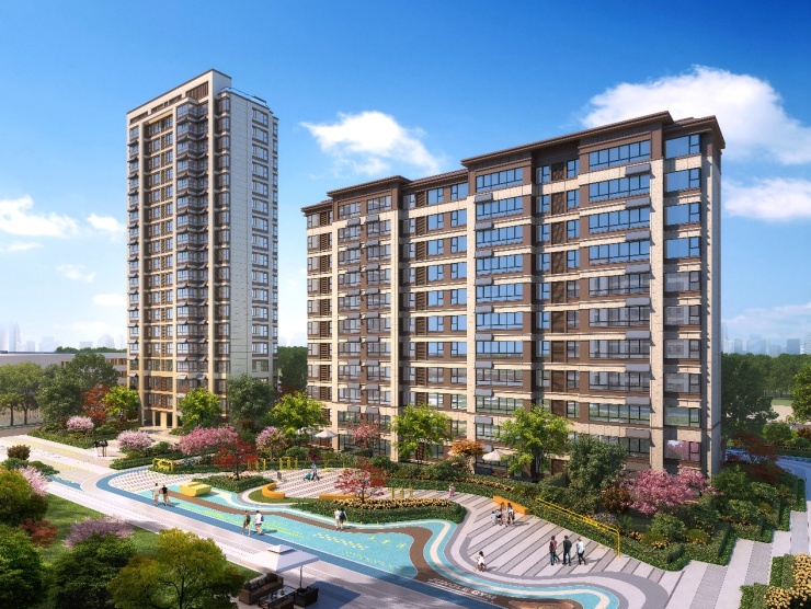 北城正荣府项目运用中国传统园林漏景和借景手法,一步一景,入户后分别是连廊、水院、儿童乐园、运动场,简约的景观形式与大气典雅的中式建筑相融合,营造森林花园般的居住体验。