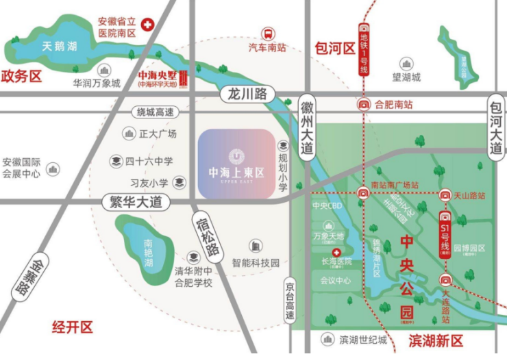 中海上东区择址城市发展命脉,占据资源高地所在。处于主城包河、政务新区、滨湖新区以及经开区“四区交界”的核心地段,坐拥这四大板块的优质资源和发展红利,既是合肥的几何中心,也是全城的战略要地。