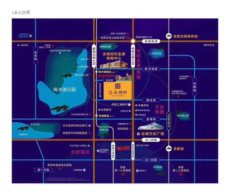 项目近邻梅冲湖,坐享5大交通主轴,周边地铁8号线、蒙城北路及阜阳北路高架,三轴交汇,拓宽合肥城市框架,门口更有多条公交路线,多维立体交通路网,无缝链接主城繁华;项目尽揽万达广场(在建中)&世纪金源购物中心双重繁华商圈,正对梅冲湖中学。情境式全龄互动住区,5重智能安防系统,自配沿街商业、儿童活动场地、环形漫步道、羽毛球场等多元社区休闲,力筑品质生活。