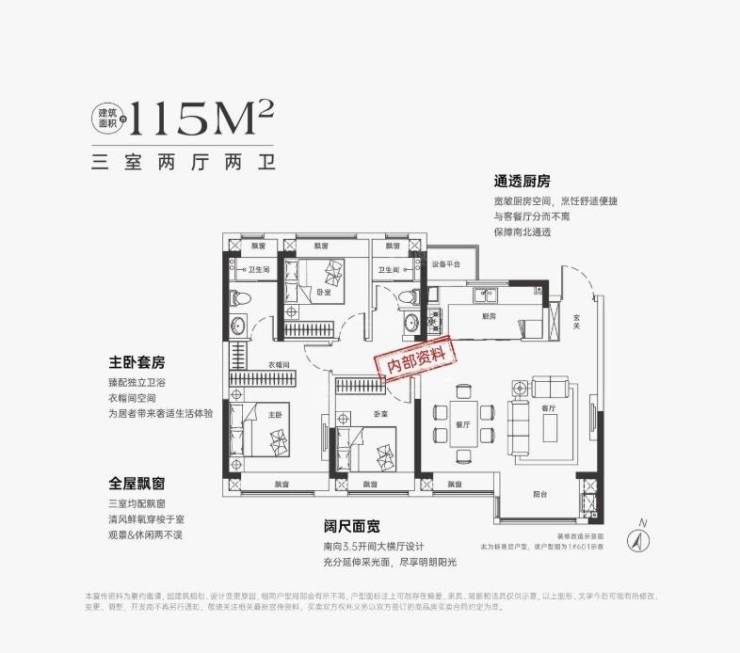 104㎡户型的南向大横厅设计,采光俱佳,南北通透,客餐厅宽景设计,厨房大面宽,通透性好。三个卧室均配有飘窗,主卧套房设计,独立卫浴空间,为居住者提供舒适的生活空间。整体风格简约大气,适合现代家庭居住。