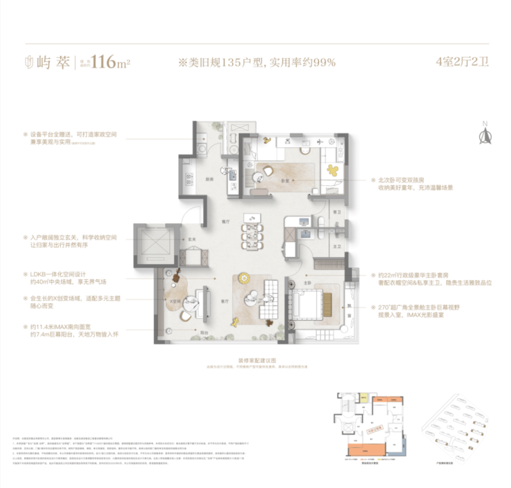 舒适宜居户型设计是项目的重要亮点。四款主力户型均采用方正布局、南北通透设计,充分利用低密优势,采光通风俱佳。户型空间利用率高,无浪费面积,细节设计贴心,如全景飘窗、干湿分离卫生间、U 型厨房、独立衣帽间等,提升居住便捷度与舒适度。刚需户型低总价、低压力;刚改户型兼顾实用与舒适;改善户型空间阔绰、功能齐全,适配家庭不同阶段的居住需求,让每一位购房者都能找到心仪房源。