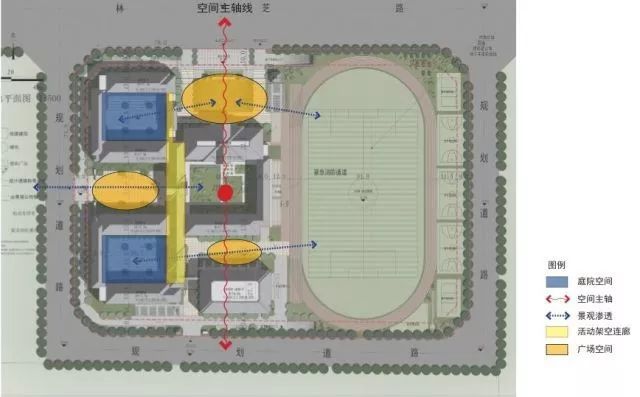 通过品字形的校园布局,梳理出普通教室、专业教室、梦想花园等三个不同层次的功能空间。使学生们既有宁静的学习环境、也有运动、嬉戏的室外空间。