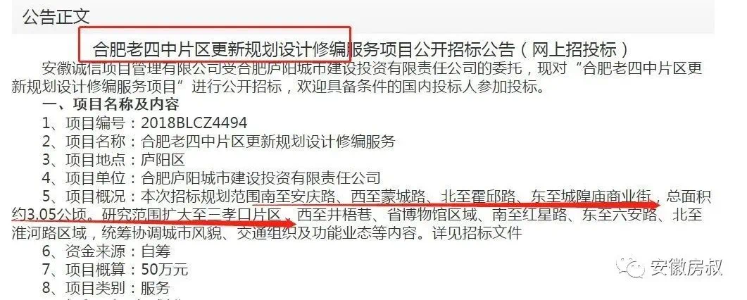 2018年12月,安徽公共资源交易中心近日发布招标公告,合肥老四中片区更新规划设计修编服务项目正式启动招标。
