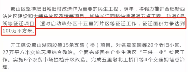 蜀山发布透露:蜀山区2020年将适时启动政务区十五里河片区等征迁工作,征迁面积力争达到100万平方米。除了十五里河片区,中盐红四方老厂房、十八岗村、日化纸箱厂宿舍、821宿舍以及常青姚公粮站,均有拆迁计划。