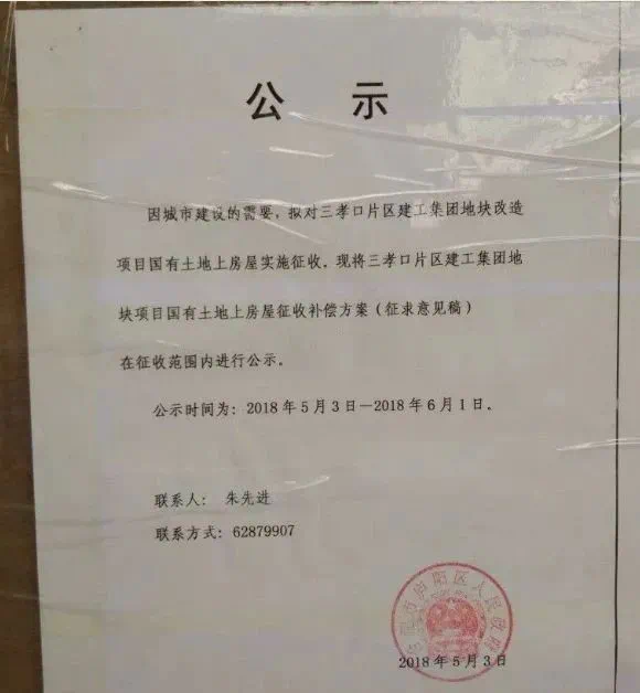 按照公告,其中征收范围为:庐阳区三孝口片区建工集团地块项目规划范围内的国有土地上的房屋及其附属物、构筑物、四周界线。