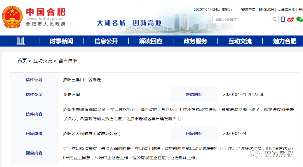 4月24日,庐阳区人民政府(政府办公室)回复:经三孝口街道核实,来信人询问的是三孝口建工地块,政府前两年就启动此地块的征迁工作。经过多次动员,但仍没有达到70%的业主同意,只好中止征迁工作,但公房现在正在进行征迁拆除工作。