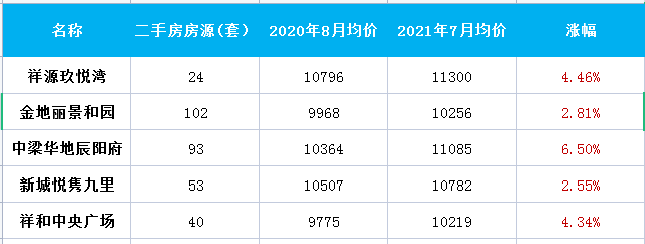 这张表罗列了北城部分二手房近一年以来的涨跌情况,从表中可以看到,北城的二手房房价涨幅在-3.38%-19.96%之间,总体是比较平稳的。